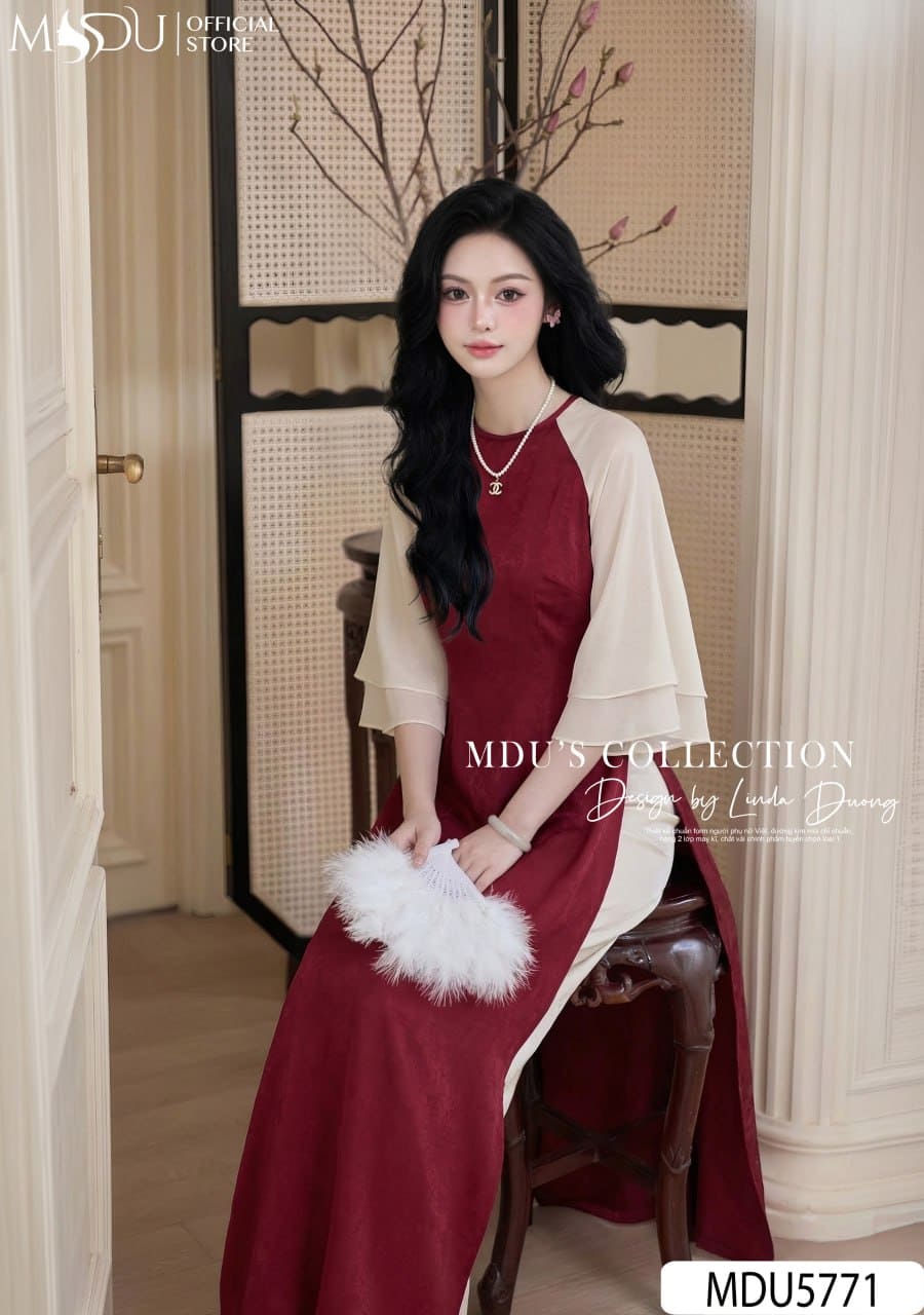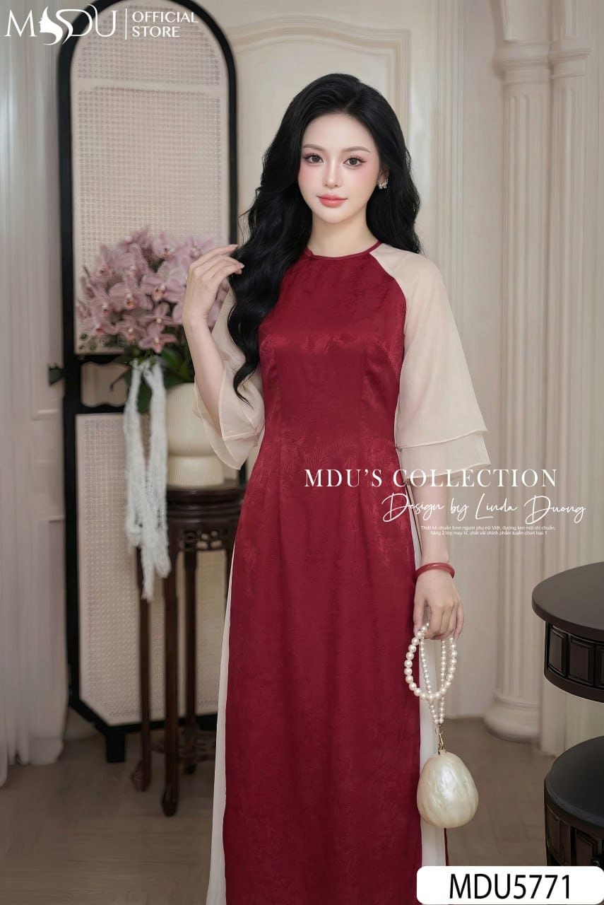 Thiết kế cổ tròn trẻ trung mang lại vẻ đẹp hiện đại và nhẹ nhàng cho tổng thể. Phần tay lửng dáng cánh bằng tơ óng mềm mỏng màu trắng tạo sự tương phản tinh tế, giúp trang phục trở nên mềm mại và bay bổng hơn khi nàng di chuyển. Kết hợp cùng quần lụa satin trắng ống suông thanh thoát, MDU5771 là lựa chọn hoàn hảo cho các dịp lễ Tết, sự kiện hoặc những buổi tiệc trang trọng.