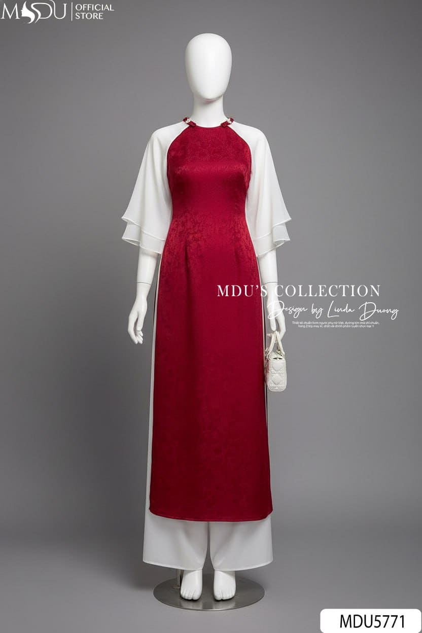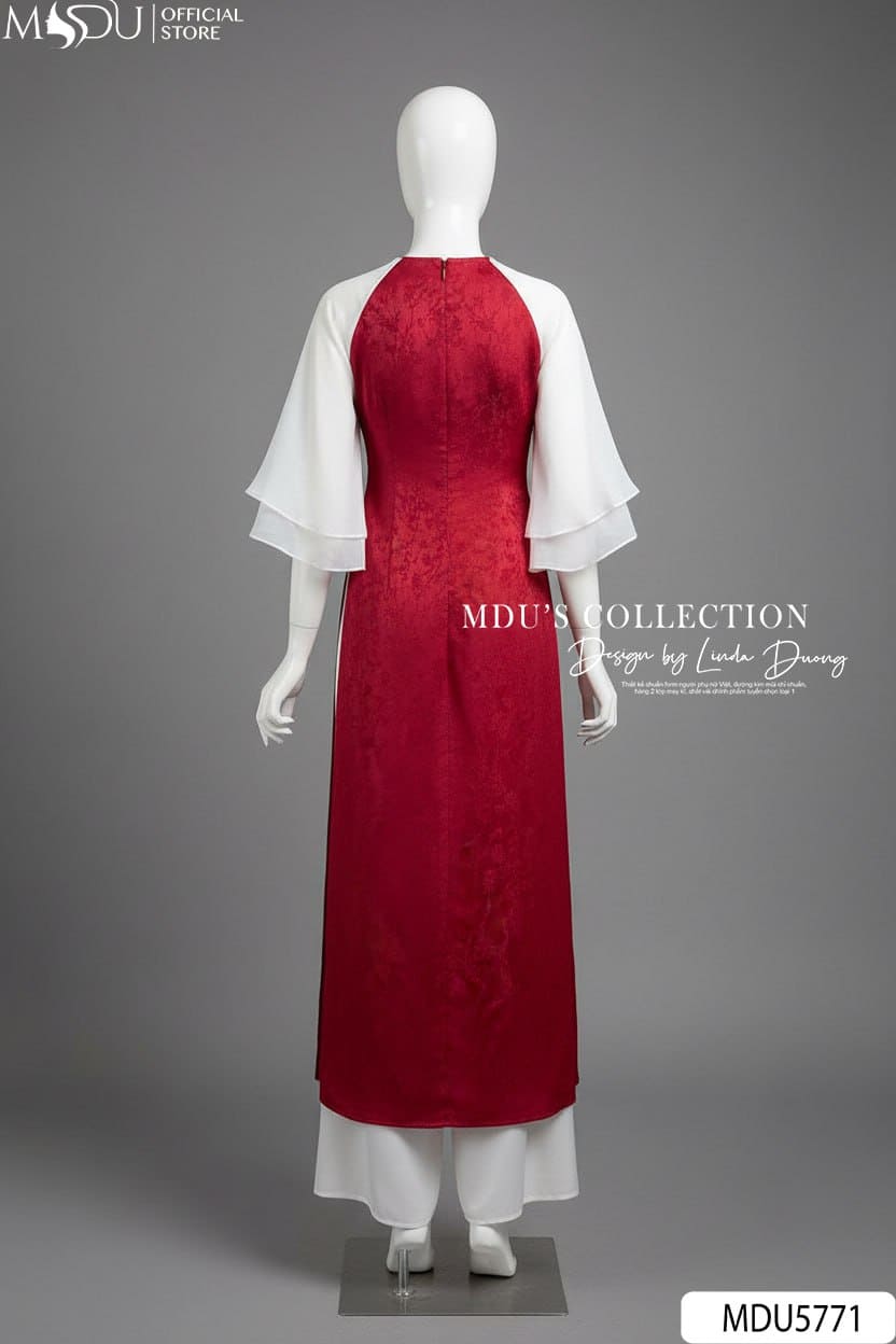 Áo Dài Thiết Kế MDU5771 Gấm Đỏ Hoa Văn Chìm Cổ Tròn Thanh Lịch Tay Tơ Óng Trắng Duyên Dáng