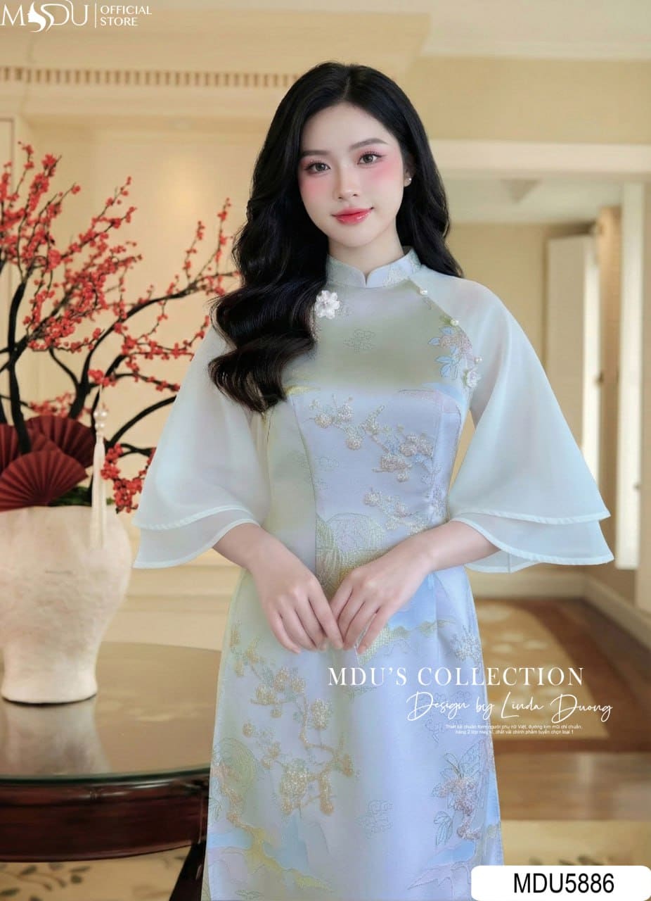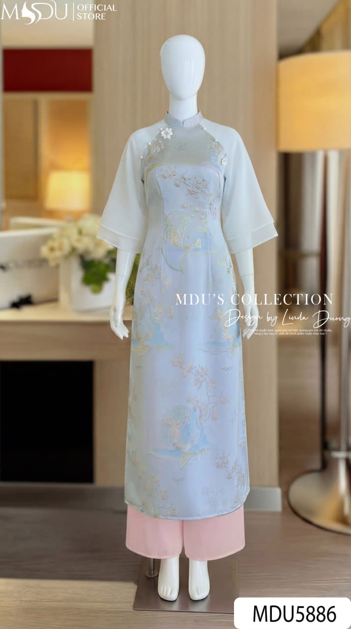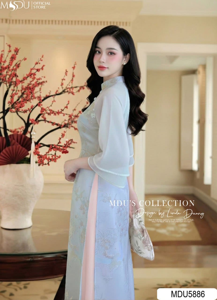 MDU Fashion hân hạnh giới thiệu thiết kế MDU5886 – mẫu áo dài truyền thống mang vẻ đẹp tinh tế của di sản kết hợp cùng hơi thở hiện đại. Sắc xanh dịu mát hòa quyện trên nền hồng nhạt thanh tao tạo nên tổng thể nhẹ nhàng, sang trọng và đầy cuốn hút, giúp quý cô tỏa sáng trong những dịp đặc biệt.