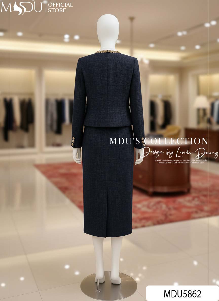 Áo khoác tay dài được thiết kế chỉn chu với chi tiết đính ngọc liền, kết hợp cúc cài và túi tiện dụng, tạo nên vẻ ngoài vừa sang trọng vừa thực tế. Chân váy dáng midi qua gối mang lại sự thanh lịch kín đáo, điểm xuyết bằng đường xẻ tà tinh tế giúp từng bước di chuyển thêm nhẹ nhàng và uyển chuyển. MDU5862 là lựa chọn hoàn hảo cho những ngày làm việc cần sự chuyên nghiệp hoặc các dịp đặc biệt, nơi vẻ ngoài thanh lịch và khí chất tự tin luôn được đặt lên hàng đầu.