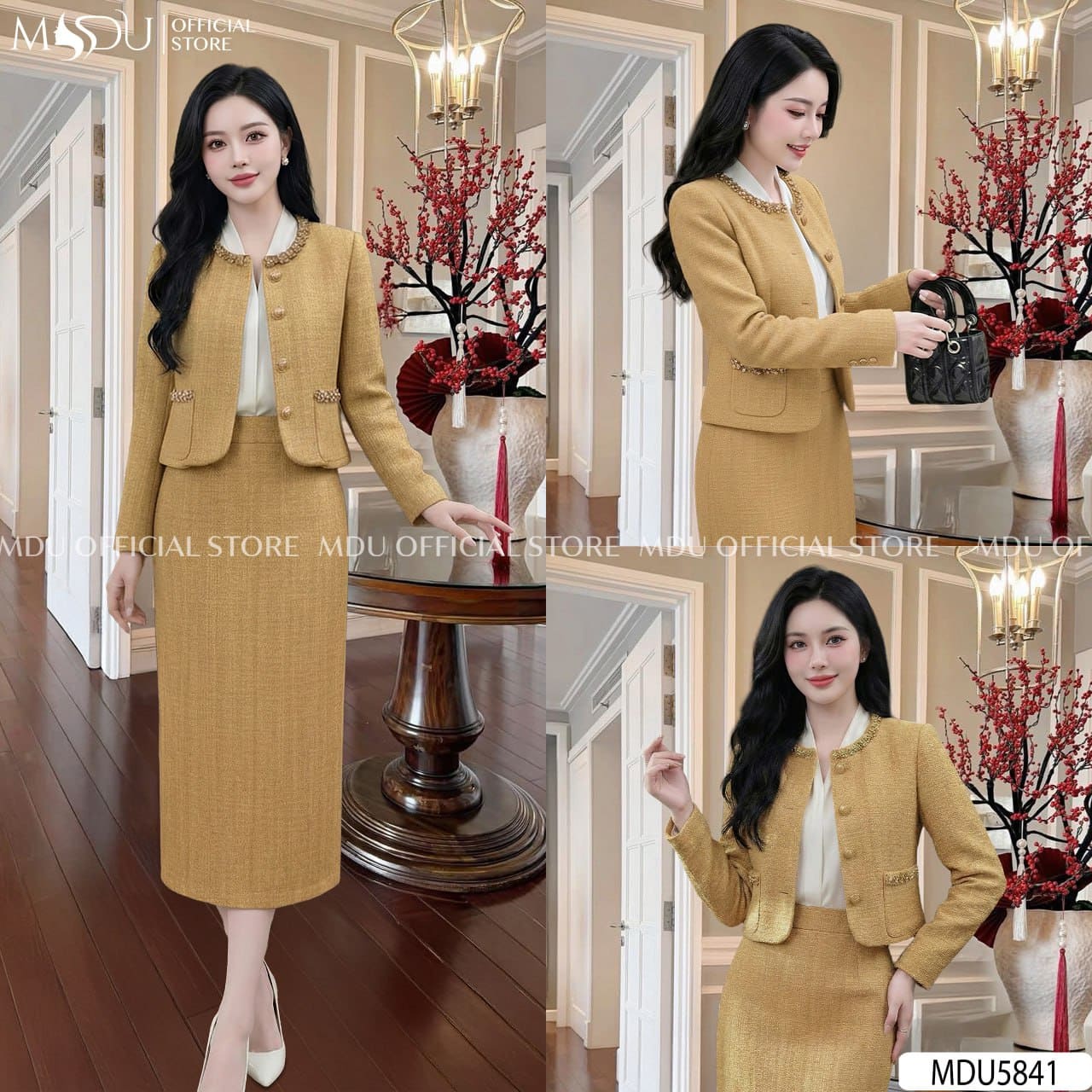 MDU Fashion giới thiệu thiết kế MDU5841 – set dạ tweed mang sắc vàng quý phái, gợi lên vẻ đẹp sang trọng và cổ điển đầy cuốn hút. Gam màu ấm áp kết hợp cùng phom dáng chỉn chu giúp tổng thể trang phục vừa nổi bật vừa thanh lịch, phù hợp cho phong cách công sở hiện đại trong những ngày thời tiết se lạnh.