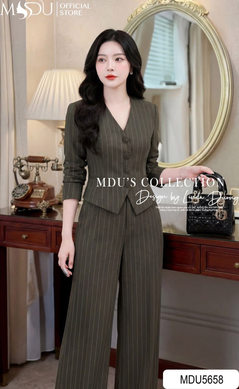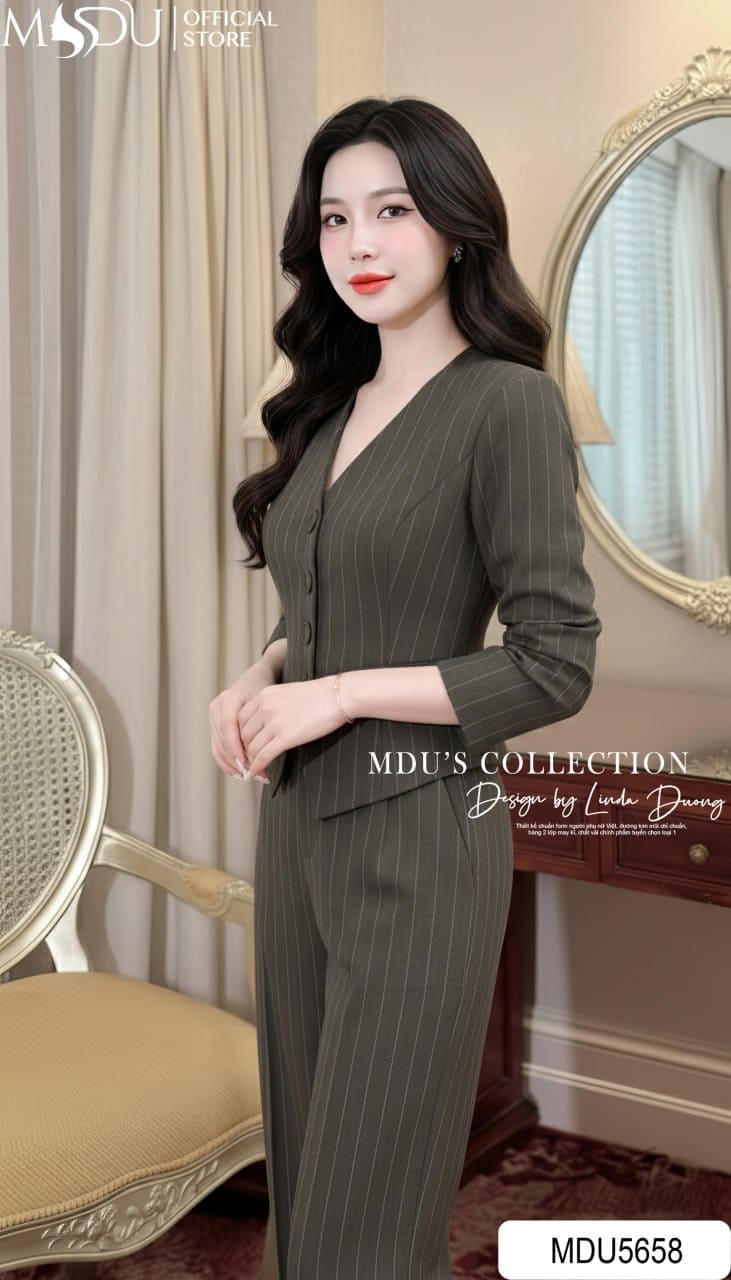 MDU Fashion hân hạnh giới thiệu set vest quần MDU5658 – biểu tượng của phong cách cá tính nhưng không kém phần chuyên nghiệp, với họa tiết kẻ sọc tinh tế trên nền vải màu thanh lịch, giúp quý cô công sở tự tin tỏa sáng trong mọi hoàn cảnh. Từng chi tiết được chăm chút kỹ lưỡng, tạo nên tổng thể sắc sảo nhưng vẫn nữ tính, hoàn hảo cho phong thái quyền lực.