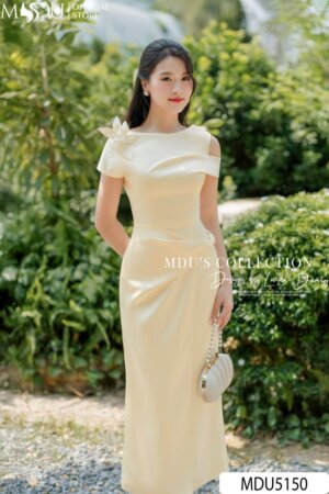 Váy Thiết Kế MDU5150 Lụa Twist Satin Vàng Pastel Suông Dài Lệch Vai Hoa 3D Thanh Nhã Và Sang Trọng