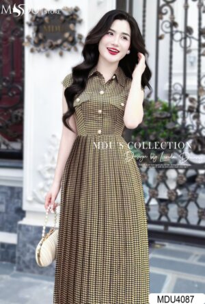 Váy Thiết Kế MDU4087 – Dáng Xòe Xếp Li Cổ Sơ Mi Cách Điệu Phối Trên Nền Vải ZicZac Độc Đáo