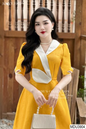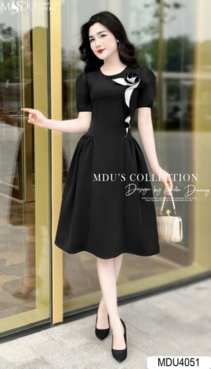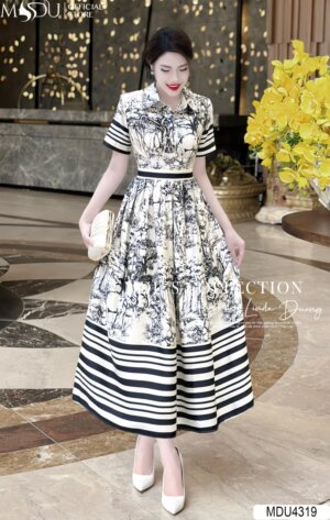 Váy Thiết Kế MDU4319 – Dáng Dài Màu Trắng Phối Đen Cổ Sơ Mi Cổ Điển Tạo Điểm Nhấn Cho Váy