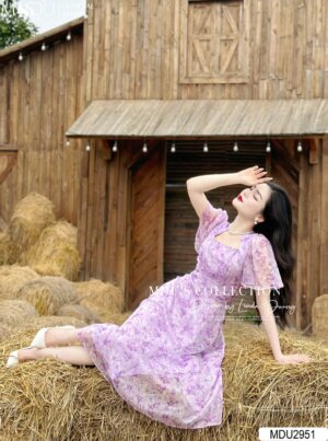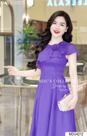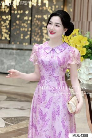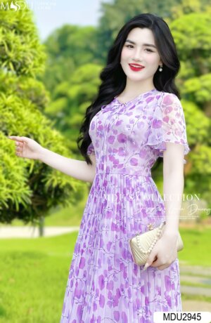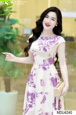 Váy Thiết Kế MDU4240 – Dáng Xòe Cổ Tròn Phối Họa Tiết Tím Trên Nền Trắng Bắt Mắt Cuốn Hút