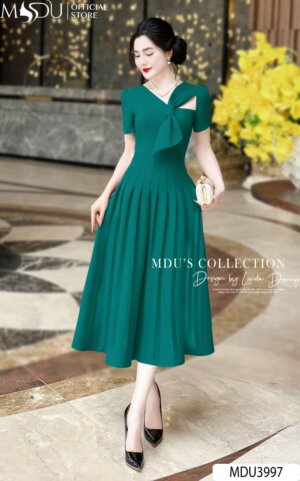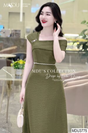 Váy Thiết Kế MDU3775 – Màu Rêu Nổi Bật Với Nơ Cài Vai Tinh Tế Tỉ Mỉ Tạo Điểm Nhấn Cho Trang Phục