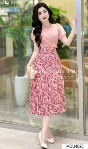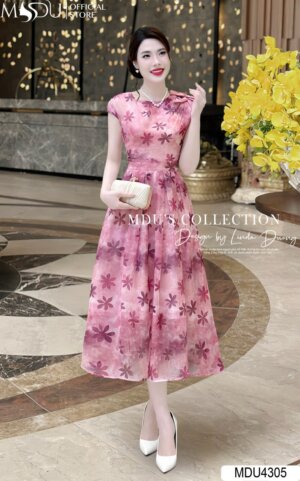 Váy Thiết Kế MDU4305 – Màu Hồng Nhạt Nhẹ Nhàng Xòe Nhẹ Cổ Tròn, Tay Hến Phối Cùng Họa Tiết Bắt Mắt