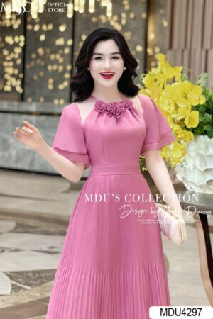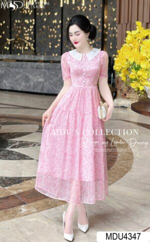 Váy Thiết Kế MDU4297 – Màu Hồng Nhẹ Nhàng Tay Bồng Cùng Chi Tiết Đính Hoa Bắt Mắt Ở Cổ Váy