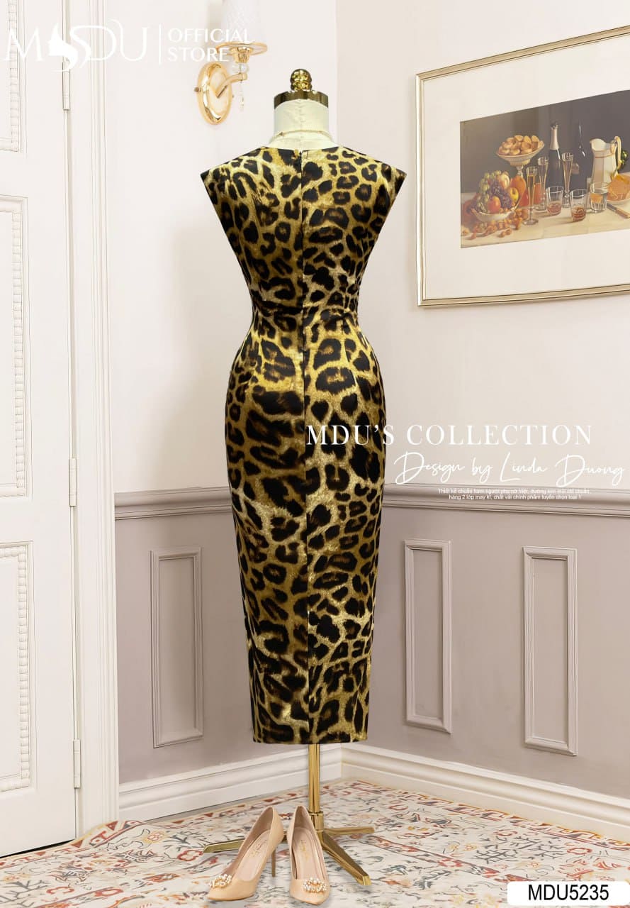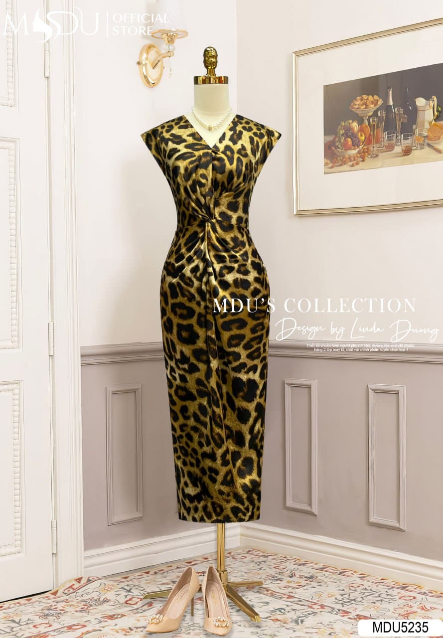 Váy Thiết Kế MDU5235 Lụa Cao Cấp Body Ôm Dài Qua Gối Xẻ Trước Họa Tiết Da Báo Quyến Rũ Và Thời Thượng