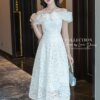 Váy Thiết Kế MDU5318 Ren Hoa Nổi & Tơ Organza Trắng Dáng Xòe Midi Vai Trễ Bồng Bềnh Thanh Khiết