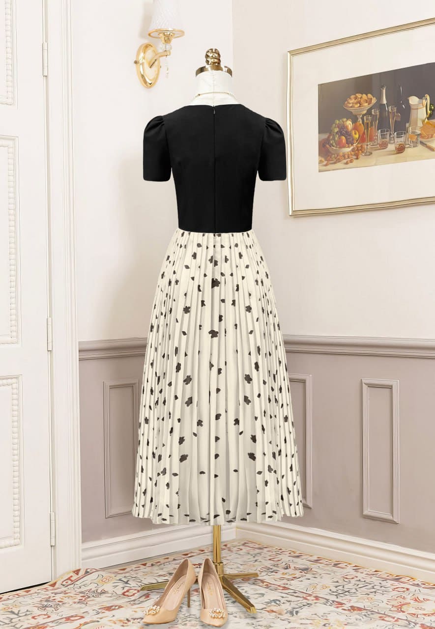 Tùng váy phối chất Tơ màu kem in họa tiết/hoa nhí đối xứng, xử lý xếp ly li ti tinh tế tạo độ xòe nhẹ nhàng, thướt tha, mang đến cảm giác bay bổng và thanh thoát trong từng chuyển động.