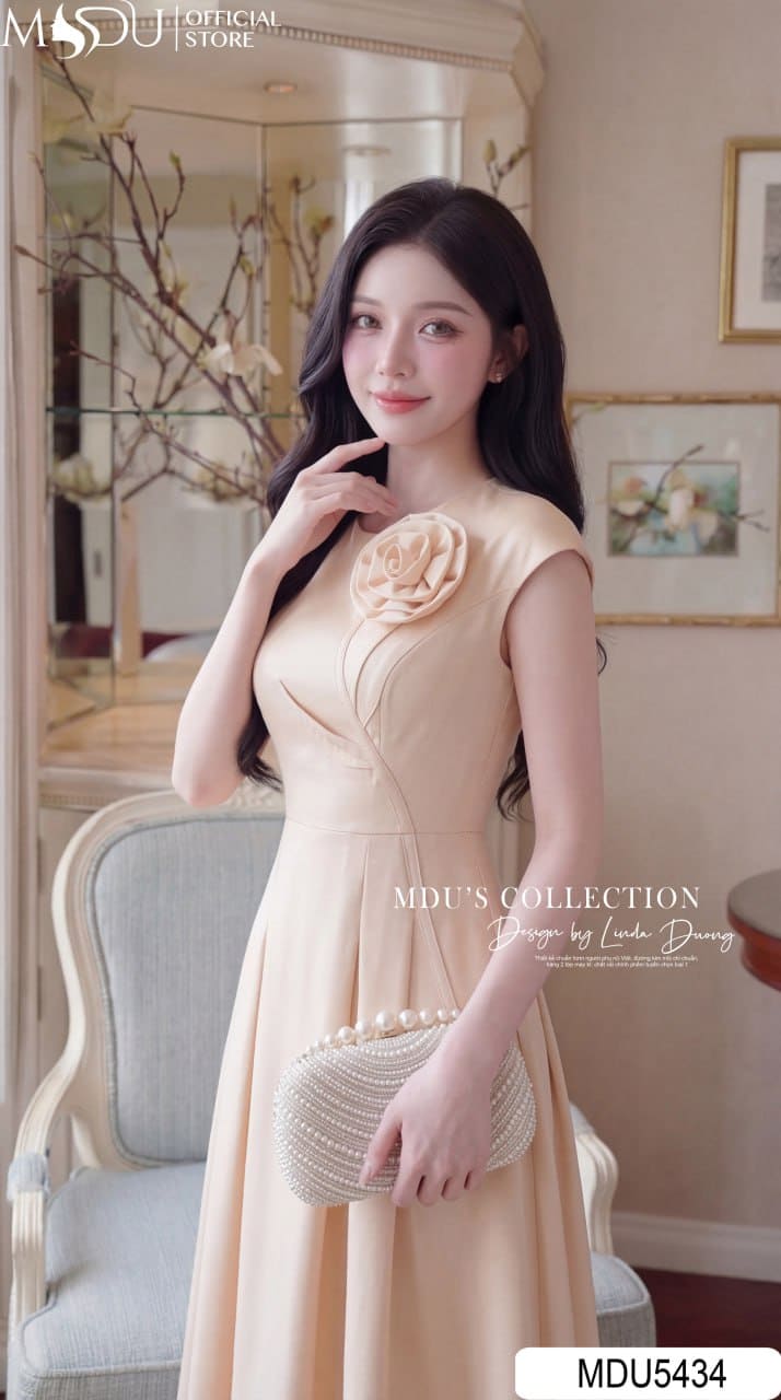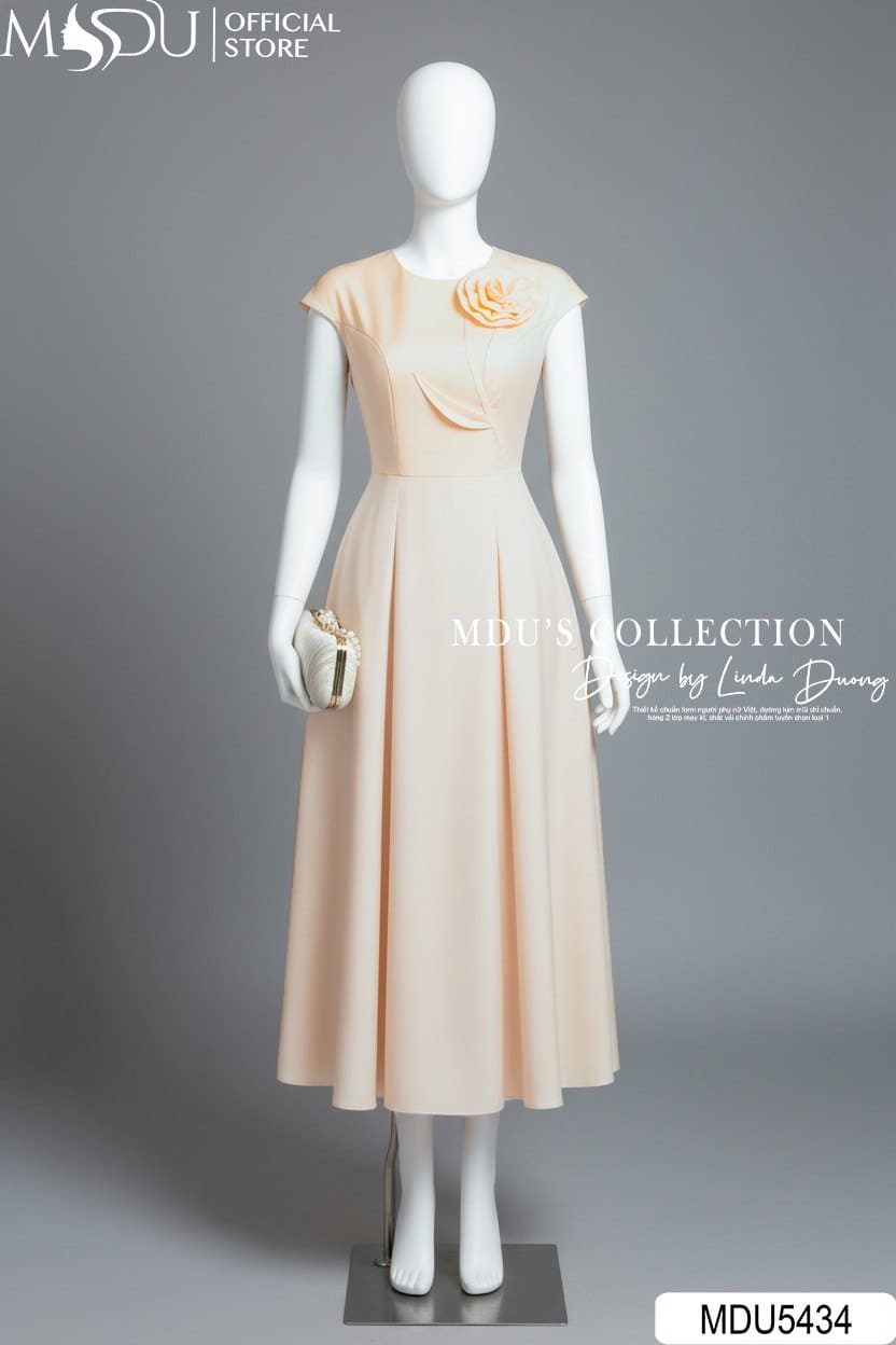 MDU5434 nổi bật với sắc kem thanh lịch và chất lụa Twist Satin cao cấp óng nhẹ. Dáng xòe midi tôn dáng duyên dáng. Tay chờm vai kín đáo. Hoa 3D thủ công tinh xảo. Phù hợp tiệc sang và công sở cao cấp.