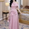 Váy Thiết Kế MDU5780 Lụa Twist Satin Hồng Ép Mùng Dáng Midi Xòe Cổ Lệch Vai Hoa Thủ Công