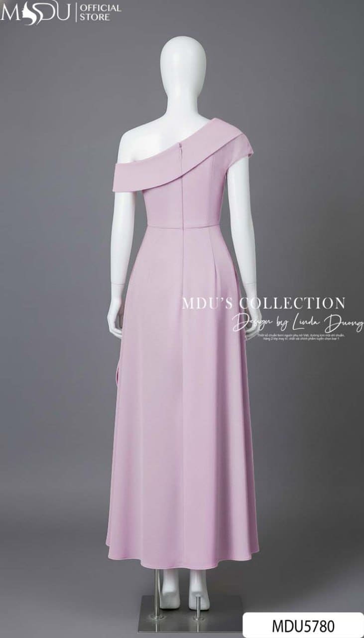 Thiết kế cổ lệch vai khéo léo tôn lên bờ vai thanh mảnh, mang đến vẻ đẹp gợi cảm nhưng vẫn thanh lịch. Điểm nhấn nổi bật là hoa đính liền thủ công kết hợp tà váy cách điệu tại eo, tạo hiệu ứng chuyển động mềm mại và lãng mạn. Phom váy xòe midi thướt tha giúp từng bước đi thêm uyển chuyển, khiến MDU5780 trở thành lựa chọn hoàn hảo cho những buổi tiệc sang trọng hoặc các sự kiện đặc biệt.