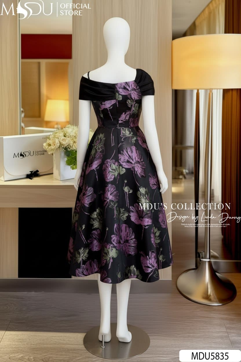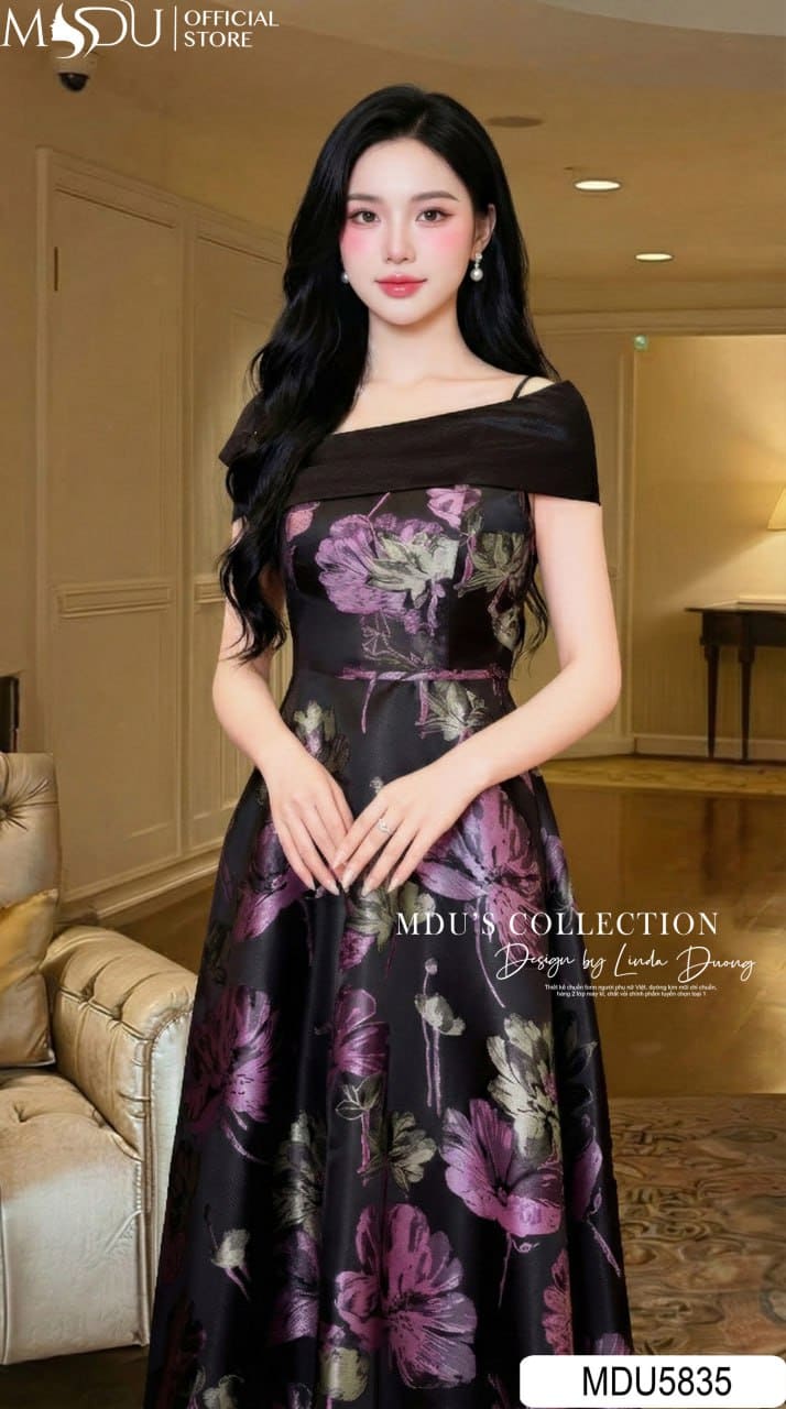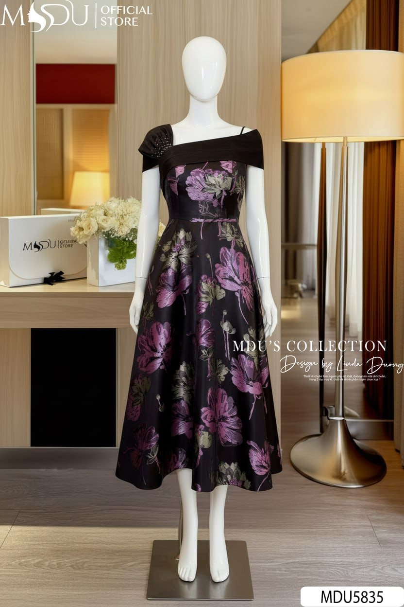 Váy Thiết Kế MDU5835 Lụa Vân Nổi Dáng Xòe Vai Chéo Đính Đá Sang Trọng