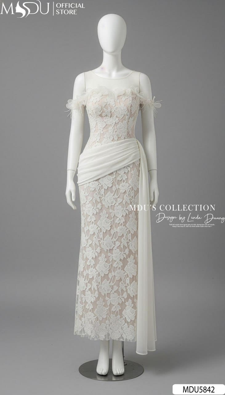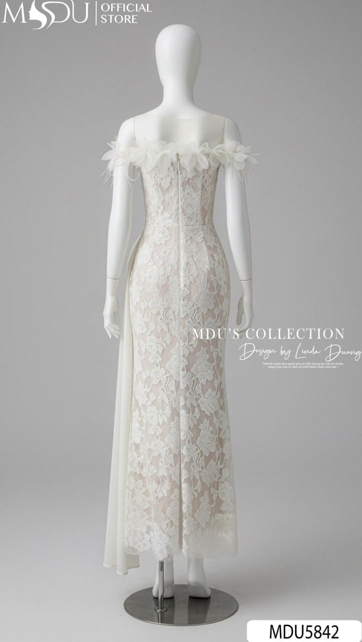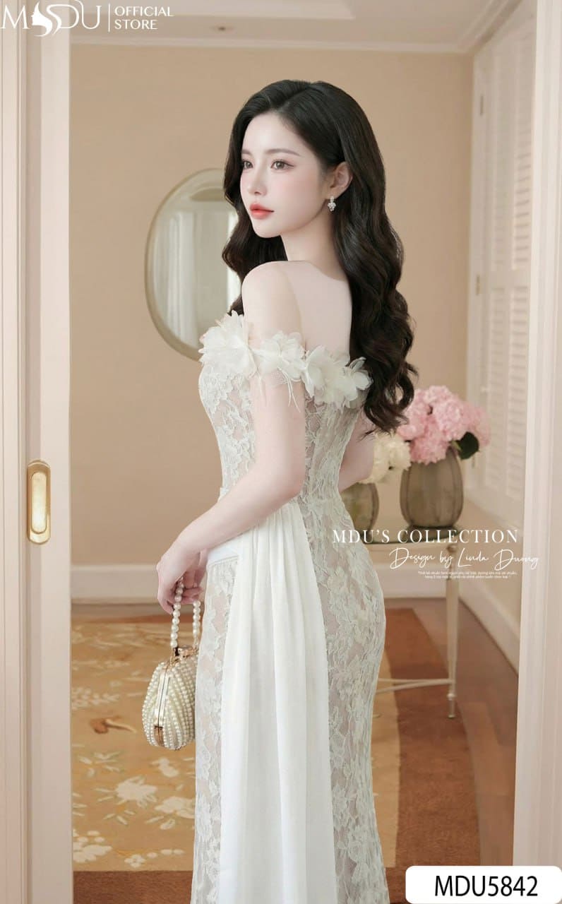 Váy Thiết Kế MDU5842 Ren Nổi Kem Trễ Vai Dây Hoa Đính Tà Tơ Óng Thướt Tha