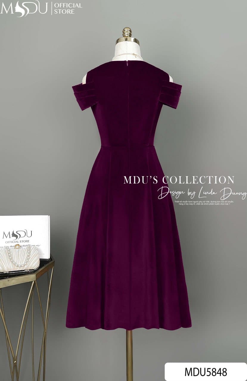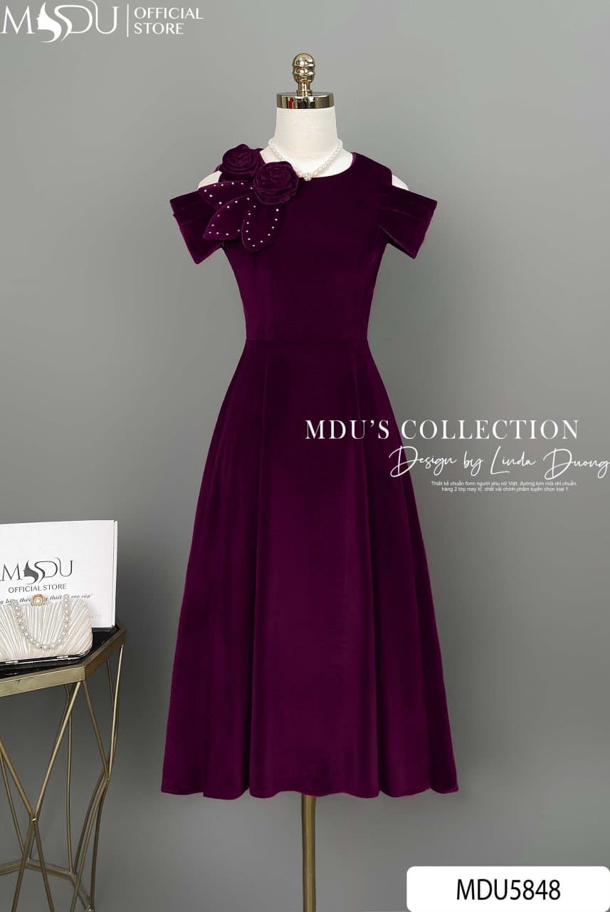 Váy Thiết Kế MDU5848 Nhung Hàn Đỏ Ánh Tím Dáng Xòe Midi Hoa Vai Đính Đá Sang Trọng