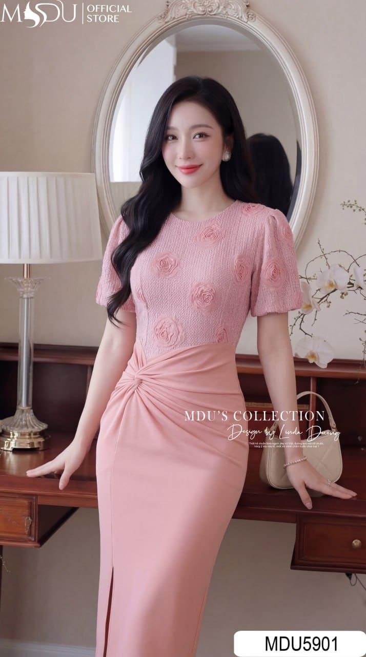 MDU5901 là thiết kế váy liền mang vẻ đẹp nữ tính và quý phái với phần thân áo ren hoa dệt nổi cao cấp tinh xảo. Chi tiết tay bồng duyên dáng giúp tổng thể thêm mềm mại và thanh lịch. Váy được may 2 lớp ở áo và chân váy giúp giữ phom ôm tôn dáng và đảm bảo sự kín đáo. Phần chân váy màu hồng trang nhã làm từ xleo Hàn cao cấp mềm mịn, co giãn nhẹ. Điểm nhấn xẻ tà bên phải tinh tế giúp nàng khoe khéo đôi chân thon dài đầy cuốn hút.