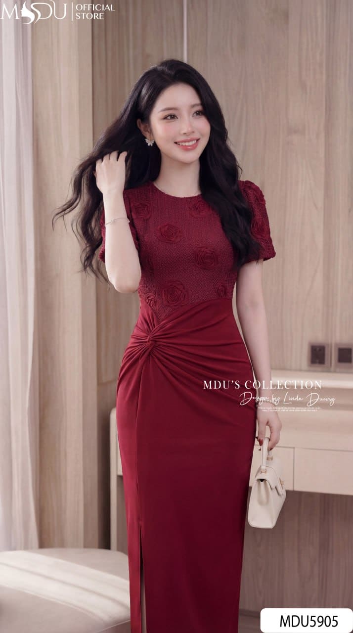 MDU Fashion trân trọng giới thiệu thiết kế MDU5905 – chiếc váy liền thân mang vẻ đẹp nữ tính và quý phái, được kết hợp tinh tế giữa chất liệu cao cấp và đường nét thiết kế hiện đại. Sự hòa quyện giữa phần thân ren nổi và chân váy đỏ đô trang nhã tạo nên tổng thể cuốn hút, giúp quý cô tự tin tỏa sáng trong những dịp đặc biệt.