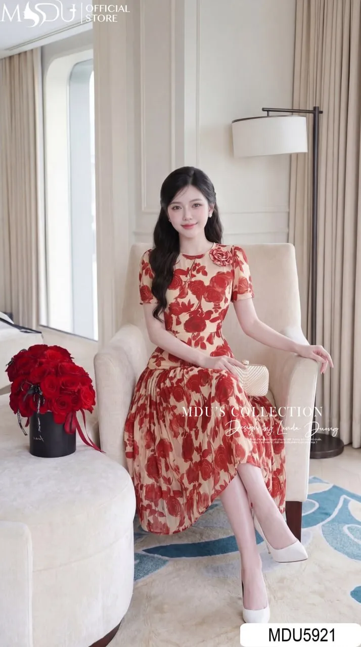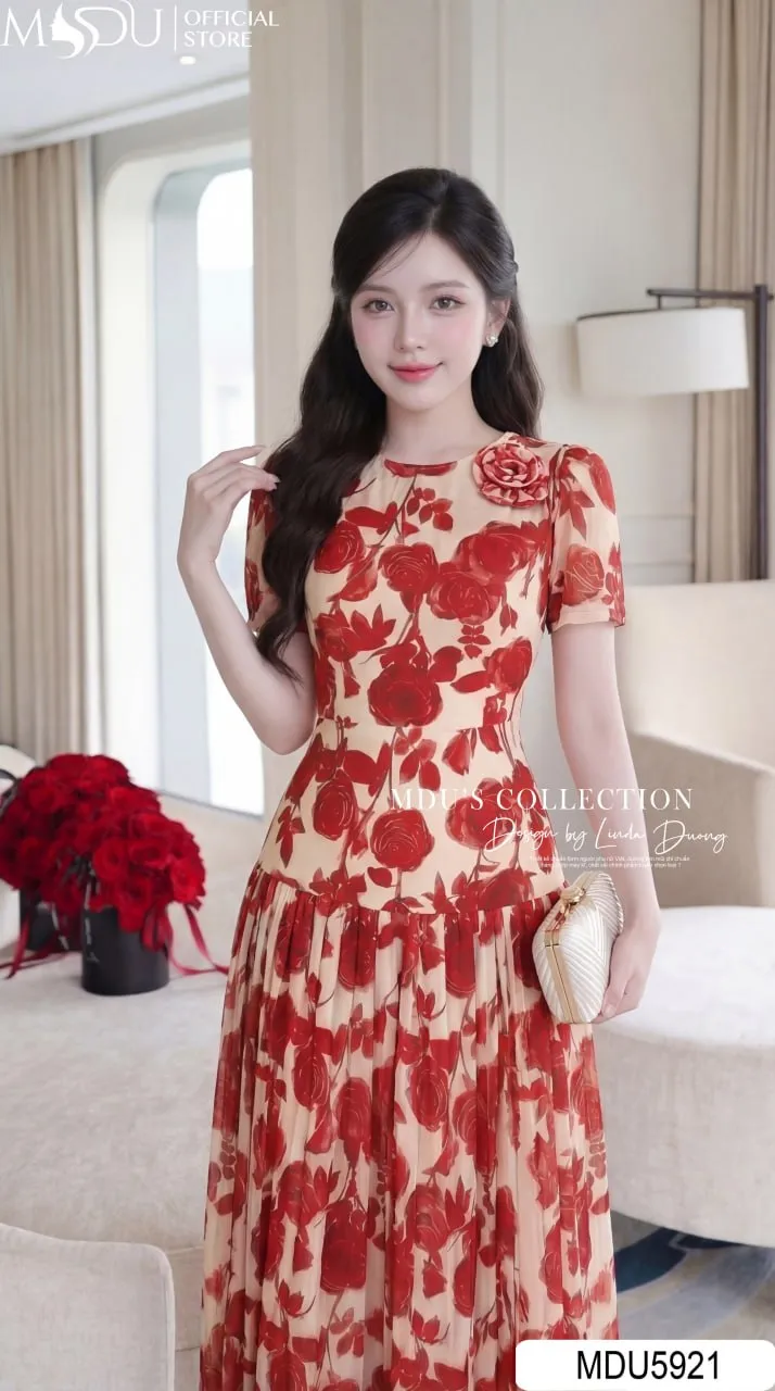Váy Thiết Kế MDU5921 Tơ Óng Hàn Kem Hoa Đỏ – Ngọt Ngào, Nổi Bật Và Thanh Lịch