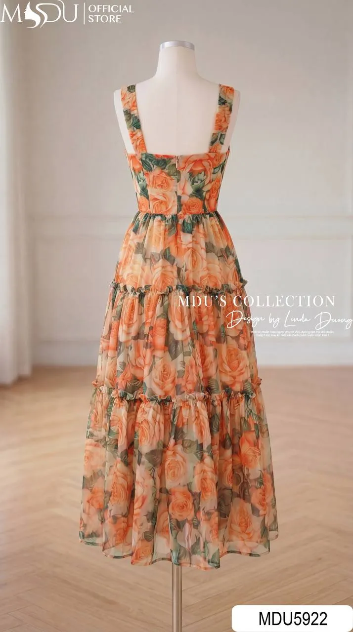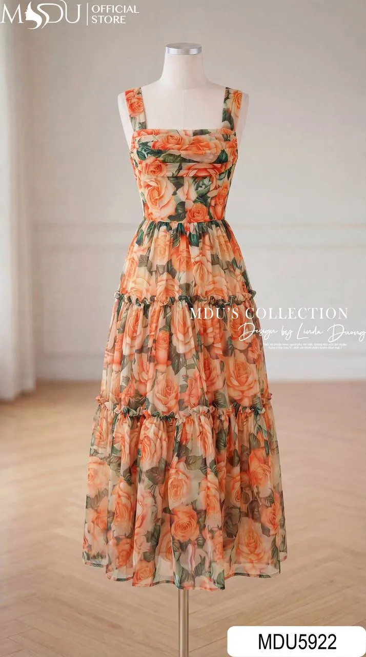 Váy Thiết Kế MDU5922 Tơ Óng Hàn Cam Họa Tiết – Rực Rỡ, Quyến Rũ Và Đầy Sức Sống