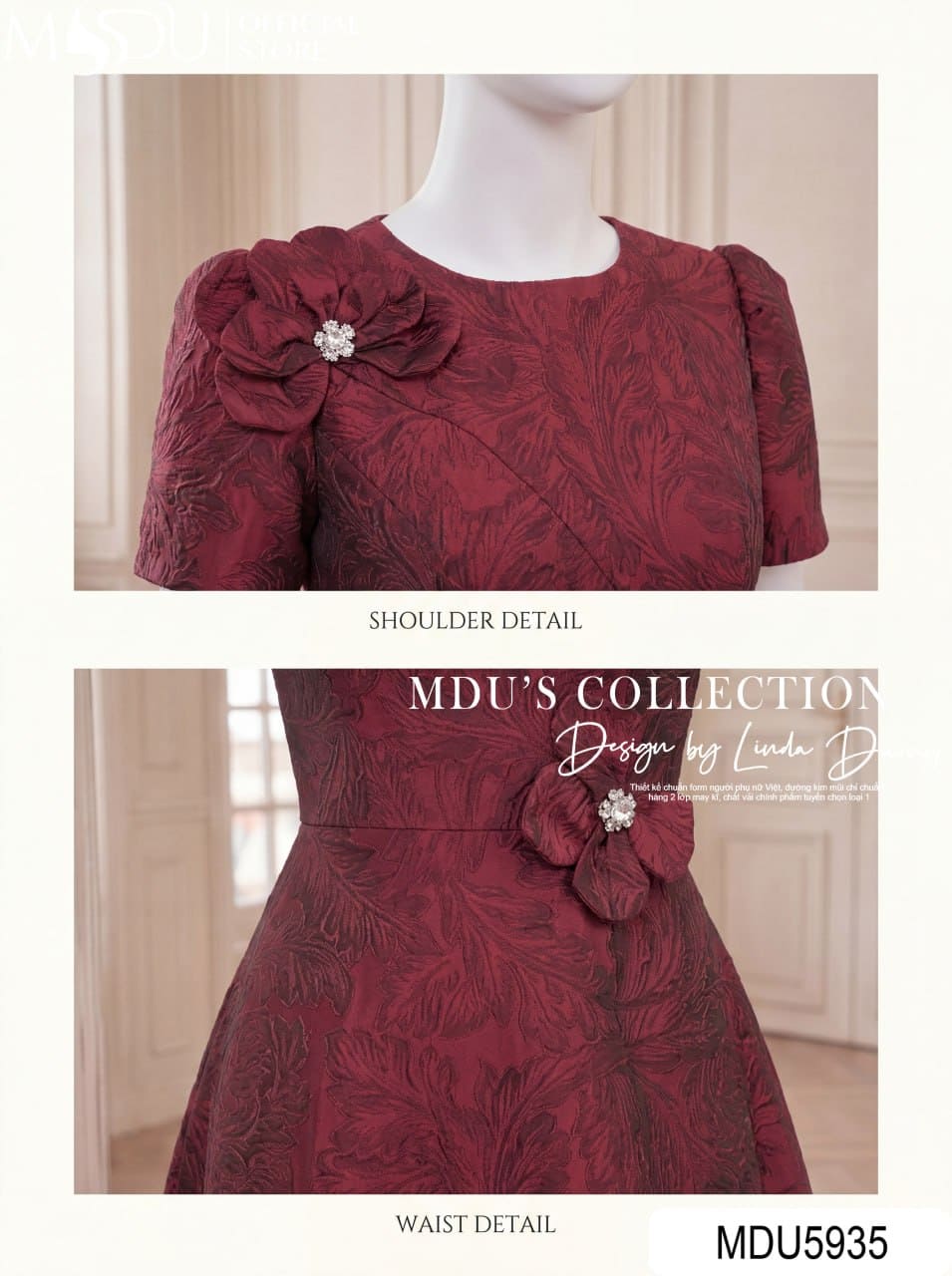 MDU5935 được chế tác từ chất liệu gấm cao cấp với bề mặt dệt hoa văn tinh xảo, mang đến hiệu ứng thị giác sang trọng và đầy chiều sâu. Chất liệu có độ đứng phom hoàn hảo, giúp giữ form váy chuẩn chỉnh và tôn lên vẻ đẹp đẳng cấp. Gam màu đỏ đô mang đến vẻ đẹp trầm ấm, sang trọng và đầy cuốn hút. Đây là sắc màu giúp nàng nổi bật một cách tinh tế, phù hợp trong những buổi tiệc hay sự kiện cần sự chỉn chu và nổi bật.
