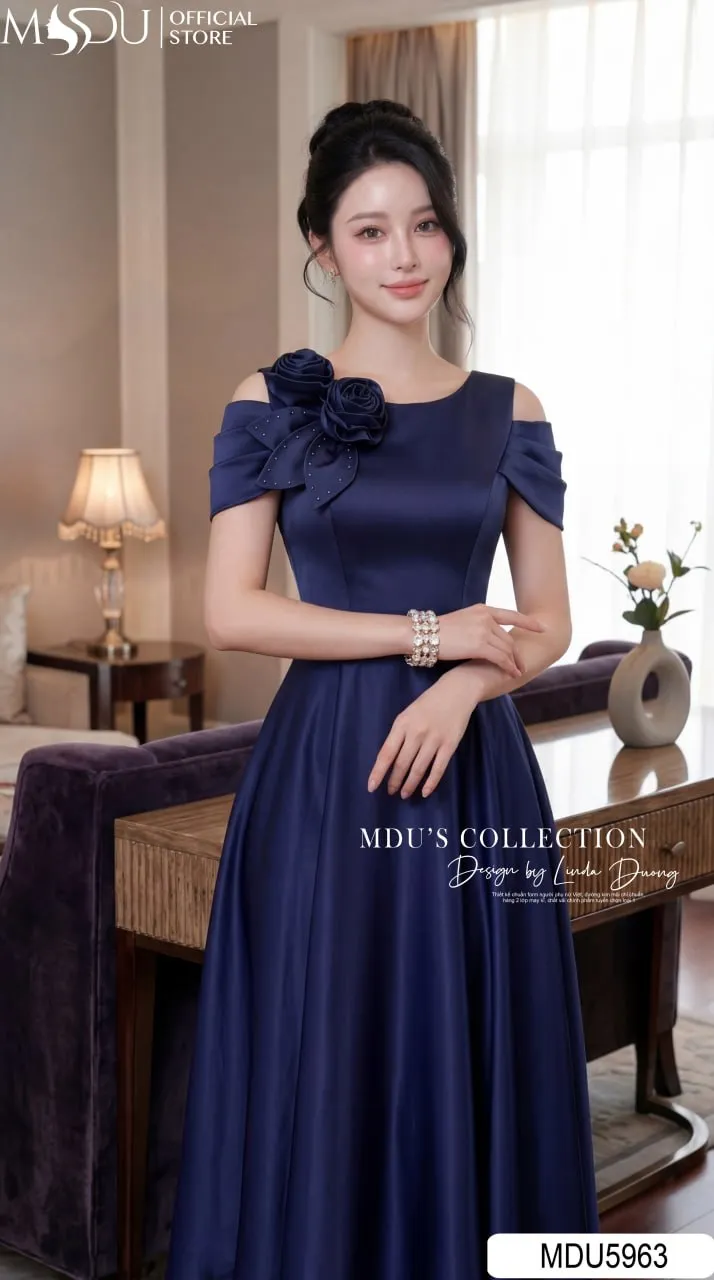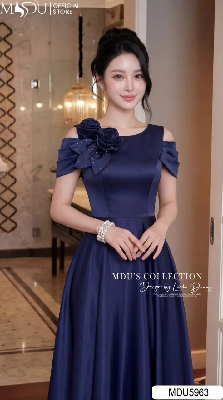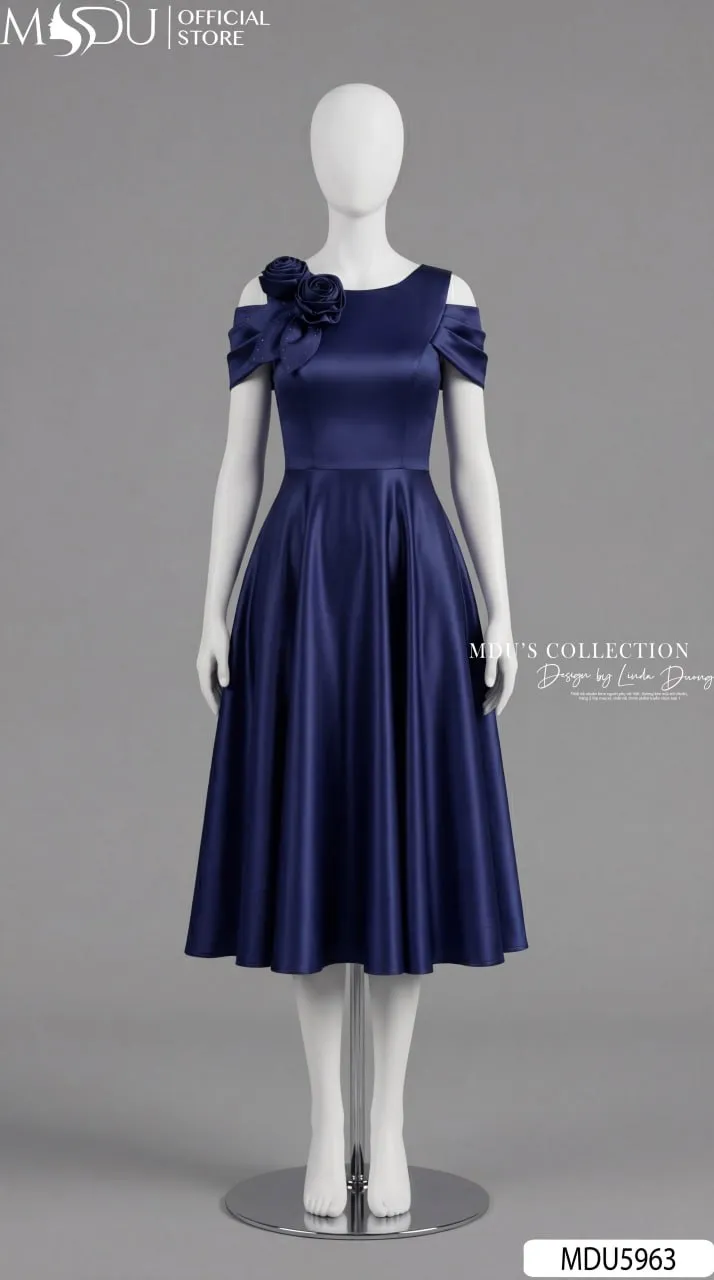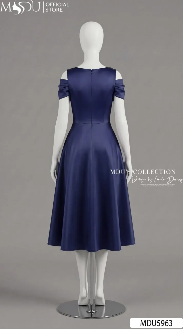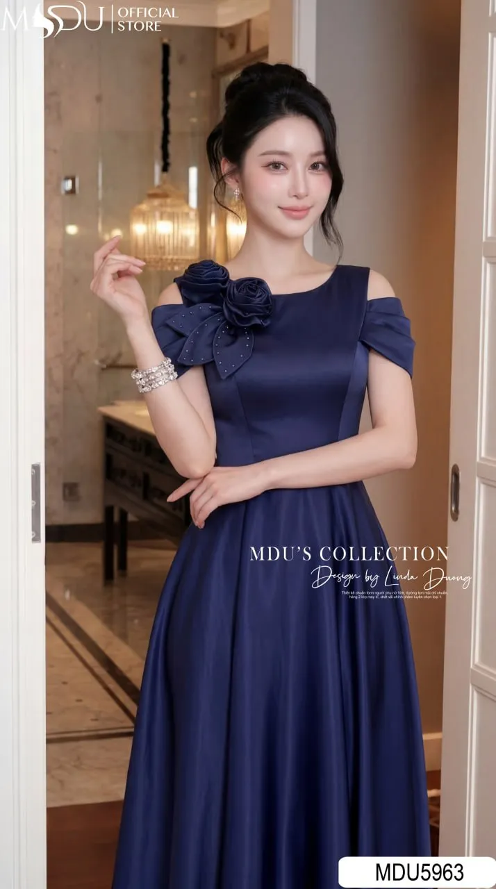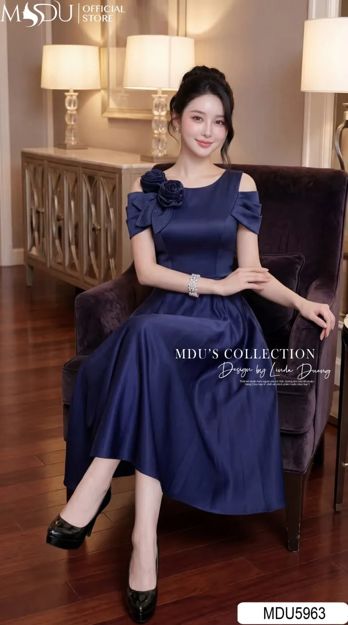 Váy Thiết Kế MDU5963 Lụa Vân Xanh Than Sang Trọng – Thanh Lịch, Quyến Rũ Và Đầy Khí Chất