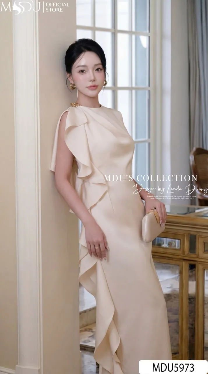 Chi tiết phụ kiện hợp kim được cài khéo léo trên thân váy như một điểm nhấn tinh tế, góp phần hoàn thiện vẻ ngoài sang trọng và quý phái. Sự kết hợp hài hòa giữa chất liệu cao cấp và thiết kế tinh xảo giúp MDU5973 trở thành lựa chọn lý tưởng cho những quý cô yêu thích phong cách thanh lịch, hiện đại và đẳng cấp.